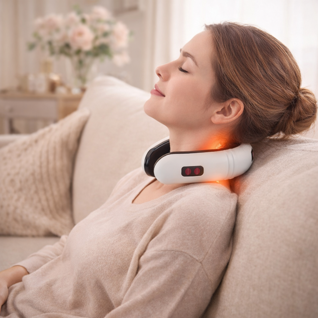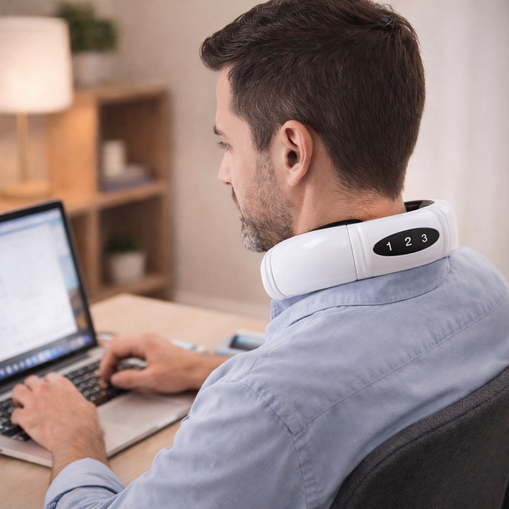 La combinación de masaje inteligente y calor terapéutico ayuda a relajar los músculos tensos y liberar la rigidez acumulada por horas frente al computador o celular.